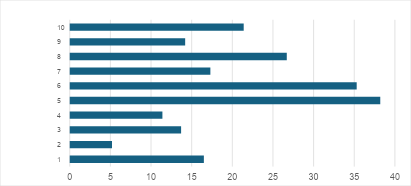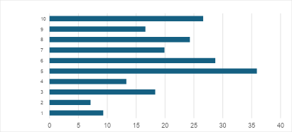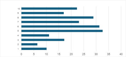 Estas valoraciones se expresan en una escala del 0 al 10, donde 0 representa la valoración más baja y 10 la más alta. Se aprecia una tendencia positiva en los resultados, con una concentración significativa de respuestas en la puntuación de 9, que resulta ser la más frecuente en los tres aspectos evaluados: 36% en trabajo en equipo, 30% en planteamiento de tareas y 34% en evaluación P2P. Este patrón sugiere una percepción muy favorable por parte del alumnado respecto a los componentes metodológicos empleados en el proyecto.