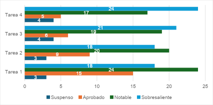 Se observa un aumento progresivo en las calificaciones de Sobresaliente, que pasa de 18 en la Tarea 1 a 24 en la Tarea 4. Por otro lado, las calificaciones de Aprobado y Notable siguen una tendencia decreciente: las de Aprobado disminuyen de 24 en la Tarea 1 a 17 en la Tarea 4, mientras que las de Notable caen de manera más pronunciada, de 15 a 5 en el mismo periodo.