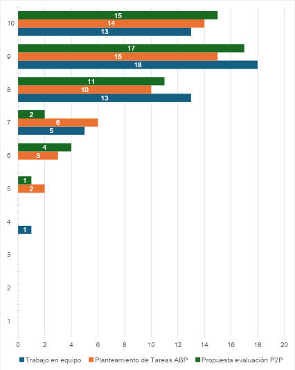 La figura anterior ilustra la media de las valoraciones emitidas por el alumnado en relación con tres dimensiones clave: el trabajo en equipo, el diseño de las tareas bajo el enfoque ABP, y la propuesta de evaluación P2P.